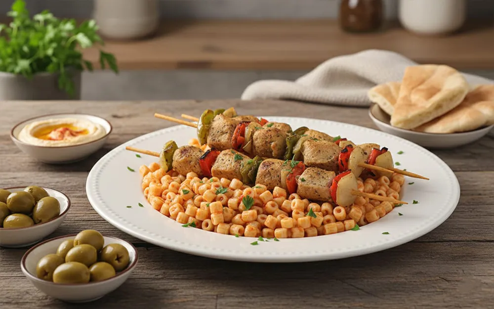 وجبة مكرونة بالصلصة مع ستيك شيش طاووق