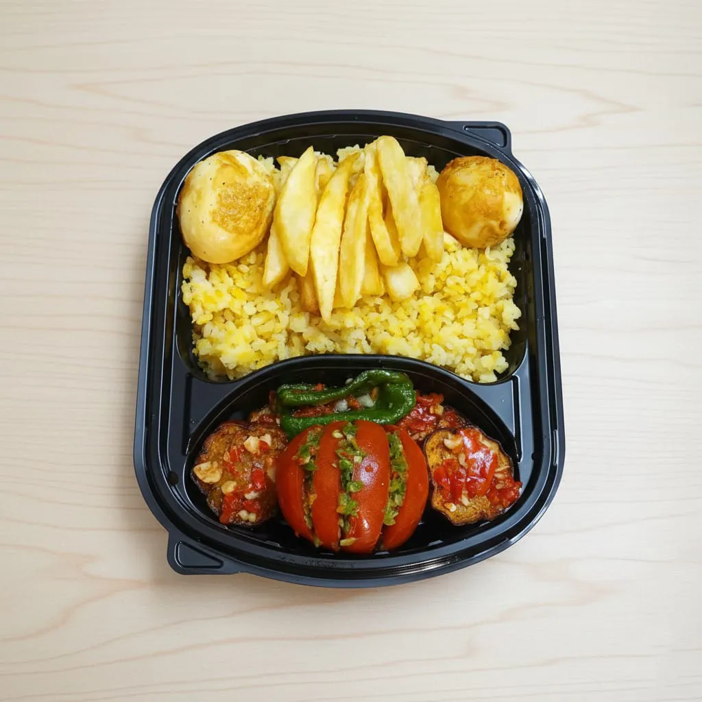 وجبة كشري اصفر + بيض+ بطاطس محمرة + باذنجان بالدقة